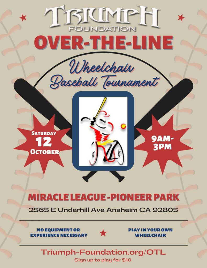 Our annual Over-the-Line Wheelchair Baseball Tournament is on Saturday, October 12th at the Miracle League Pioneer Park 2565 E Underhill Ave Anaheim CA 92805.