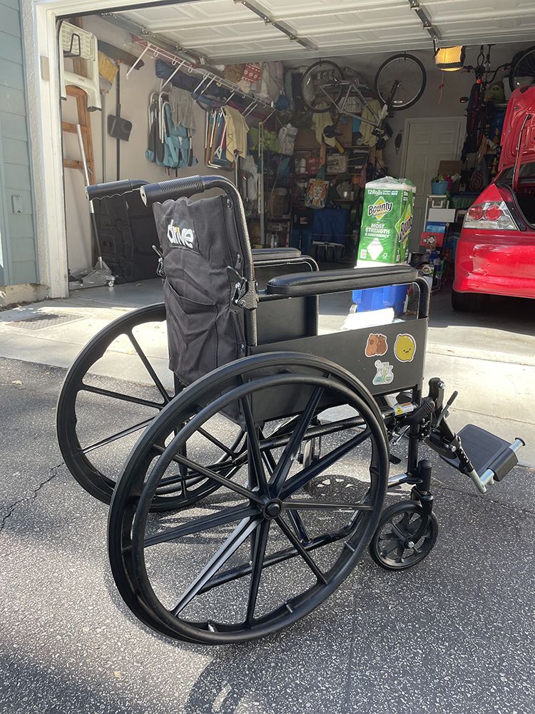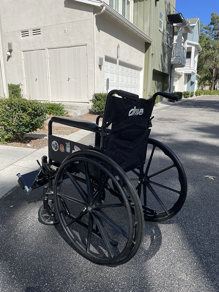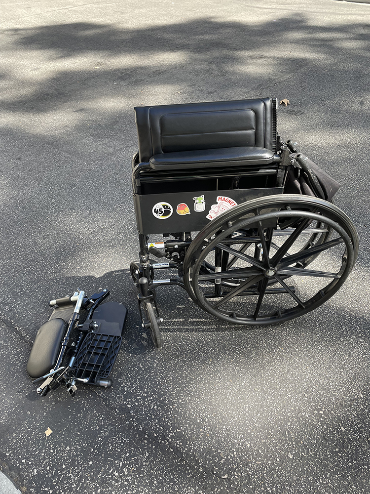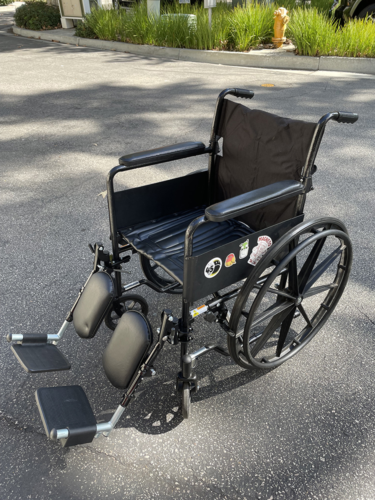 I have a Drive Silver Sport folding wheelchair available. It has a new seat and leg rests. The chair folds up and the seatback flips down.