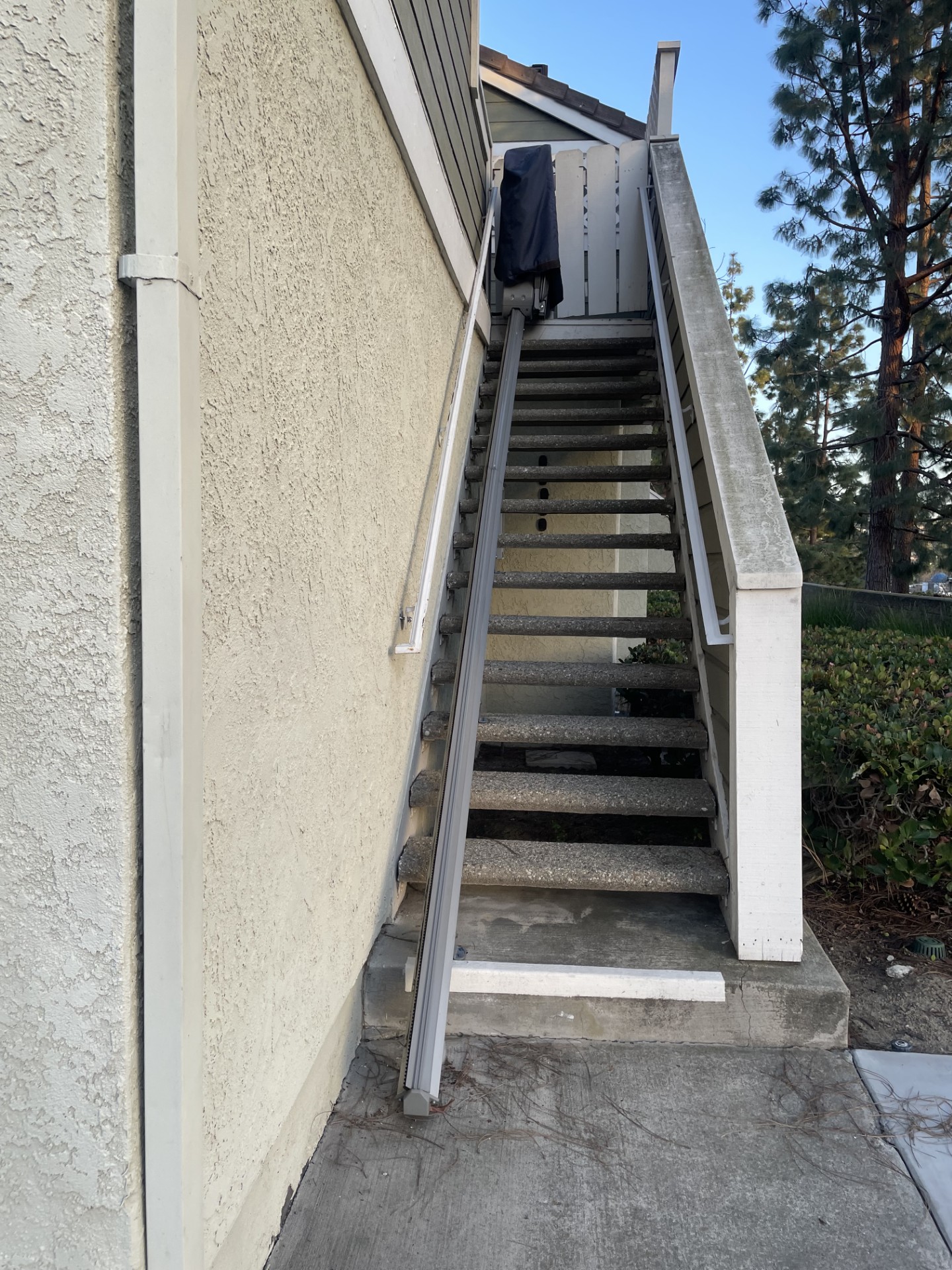 Stannah brand exterior stairlift with approx. 20 feet of straight rail, installed in 2024; located in Aliso Viejo, CA; contact [email protected] or 714-782-4480