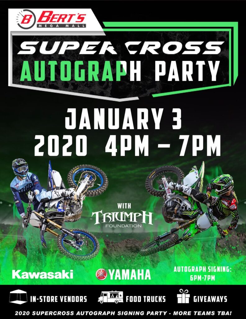 Come to the Supercross Autograph Signing Party 2020ย on Friday, January 3rd at Bert's Mega Mall benefiting Triumph Foundation.